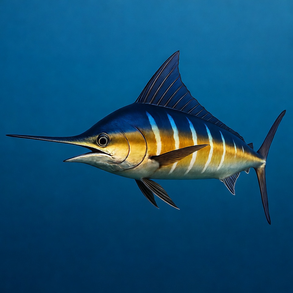 A vibrant blue marlin swims gracefully against a deep blue underwater background. The fish features a long pointed bill, striking blue and yellow stripes along its sleek body, and large dark eyes. Its fins are spread wide, showcasing detailed scales and realistic rendering.