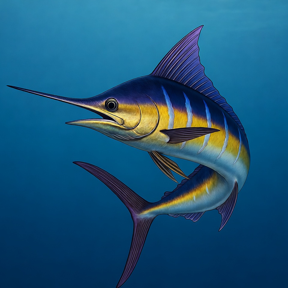 big game fish, billfish, blue water, digital illustration, fins, fish, isolated background, long bill, marine life, marlin, ocean, sea creature, sport fishing, swimming, swordfish, underwater, yellow stripes, blue marlin