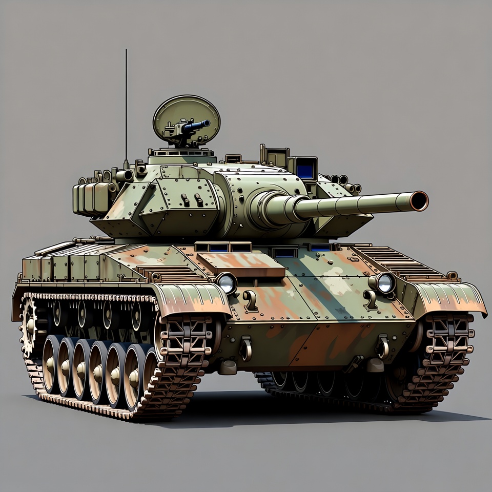 3D render, antenna, armor, army vehicle, camouflage, cannon, front view, green camo, gun barrel, illustration, isolated background, main battle tank, military, tank, tracks, treads, turret, vehicle, war machine, military tank