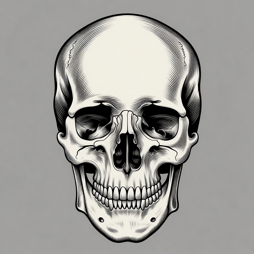 Halloween, anatomy, black and white, bones, death, detailed skull, drawing, front view, graphic, grinning skull, human skull, illustration, ink art, isolated background, line art, skeleton, vector skull, skull