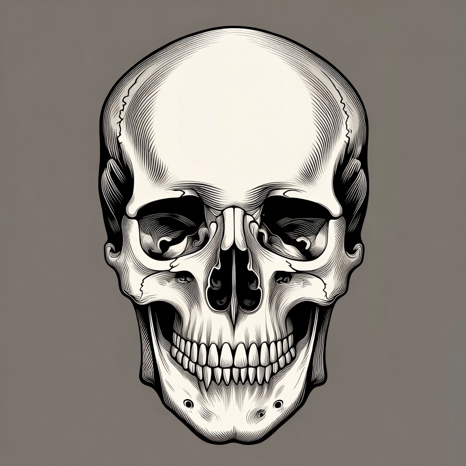 A highly detailed black and white line art illustration of a human skull is centered on a gray background. The skull features intricate shading on the cranium, eye sockets, nasal cavity, and teeth. It is drawn in a realistic anatomical style with bold outlines.