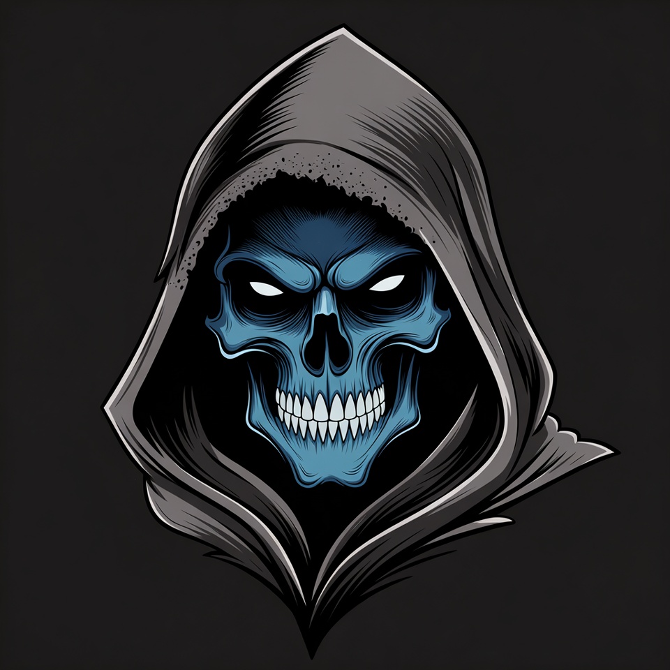 A detailed digital illustration features a menacing blue skull with glowing eyes and sharp teeth inside a dark hooded cloak. The skull has a fierce expression with arched brows and an open mouth revealing fangs. The artwork is set against a solid black background with intricate shading and highlights.
