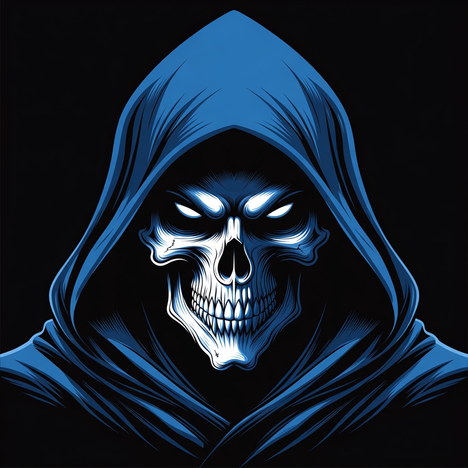 A digital illustration features a menacing skull with glowing red eyes inside a deep blue hooded cloak. The skull grins widely with sharp white teeth against a solid black background. Bold white outlines emphasize the dramatic contours of the hood and skeletal face.