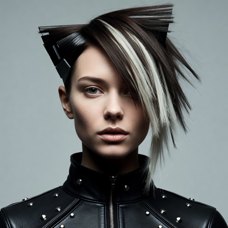 White, alternative hair, angular spikes, black white hair, bold look, closeup, collar, edgy hairstyle, fashion, female, gray background, green eyes, hair design, leather jacket, modern hair, portrait, punk style, spiked hair, streaks, studio shot, studs, unique style, woman