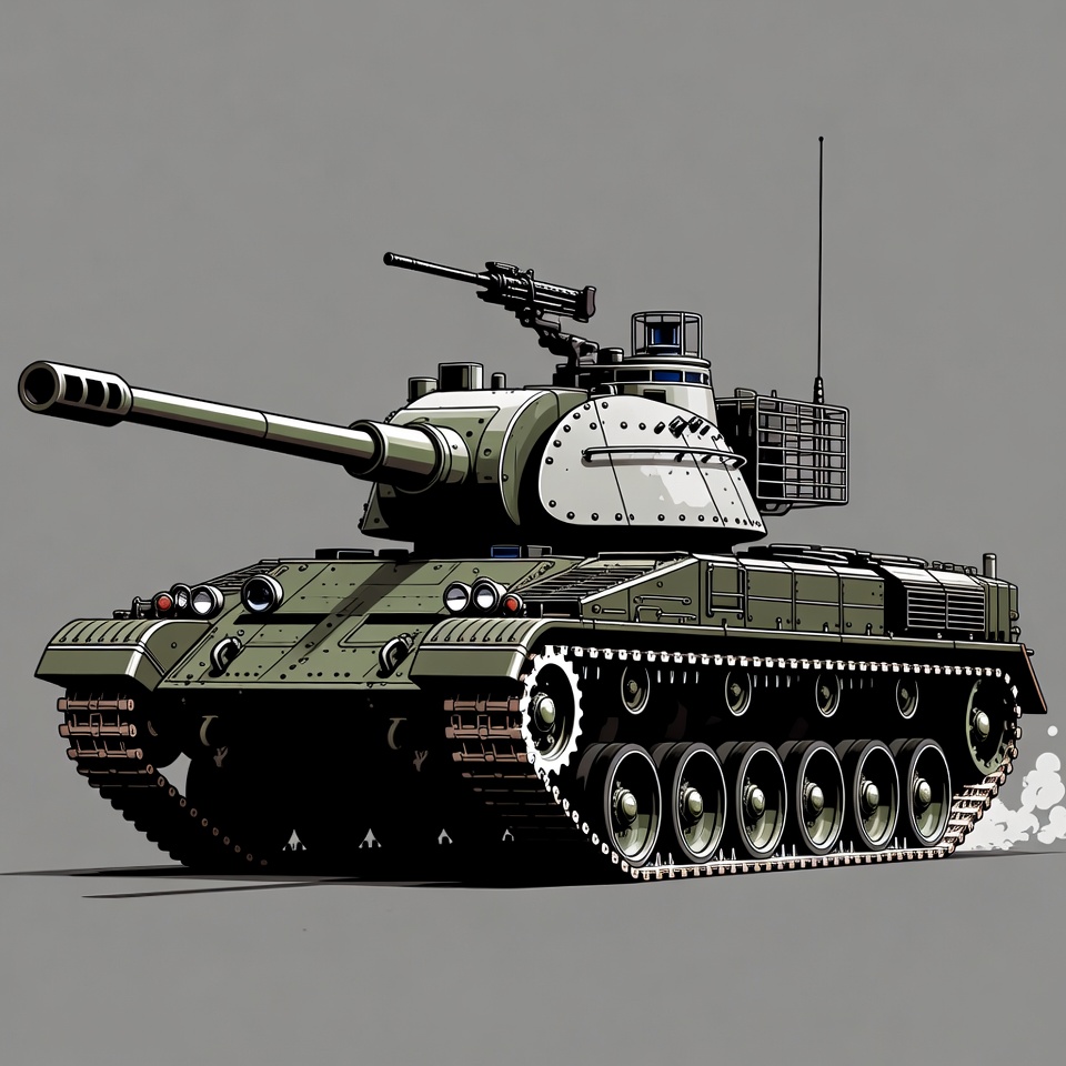 A detailed illustration of a green military tank with a large cannon and machine gun on a gray background. The tank features tracks, antennas, and a turret with white accents. Smoke trails from the rear tracks as it moves forward.