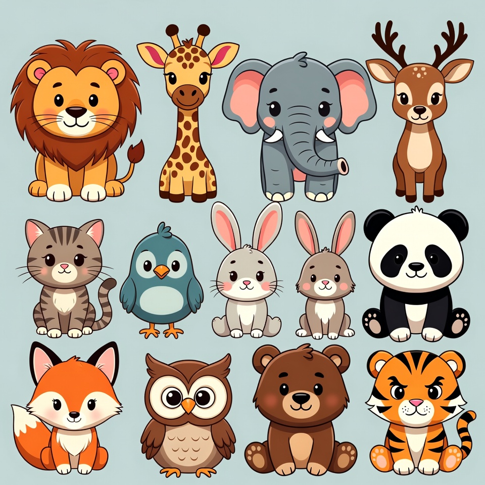 animals, baby animals, bear, bird, cat, clipart, cute animals, deer, elephant, fox, fun animals, giraffe, illustration, isolated background, kawaii, lion, owl, panda, rabbit, tiger, vector art, wildlife, zoo animals, cartoon animals