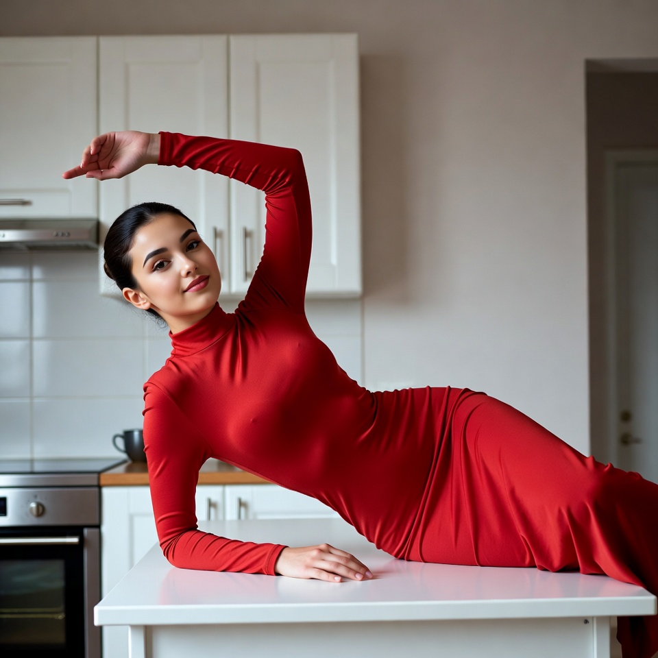 Middle Eastern, arm raised, bun hairstyle, counter, dark hair, female, form-fitting clothing, hand resting, indoor, kitchen, leaning back, long sleeve dress, modern kitchen, posing, red dress, seductive pose, turtleneck dress, white cabinets, white countertop, woman