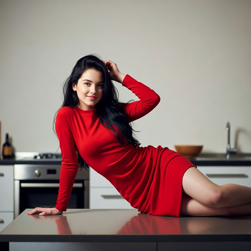 A young woman with long black hair smiles while reclining on a kitchen counter. She wears a form-fitting long-sleeved red dress and rests her hand on her head. The modern kitchen features white cabinets, stainless steel appliances, and a wooden bowl nearby.