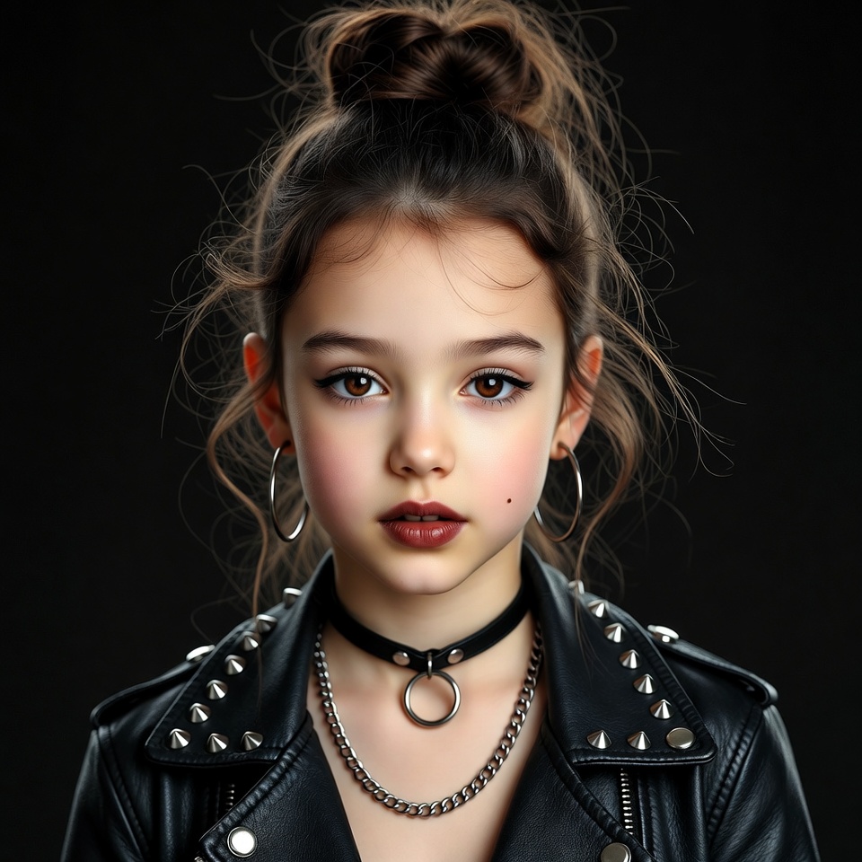 A young girl with messy bun hairstyle and large hoop earrings poses against a black background. She wears a black studded leather jacket, choker necklace with ring, and chain necklace. Her makeup includes bold red lips and defined eyes.