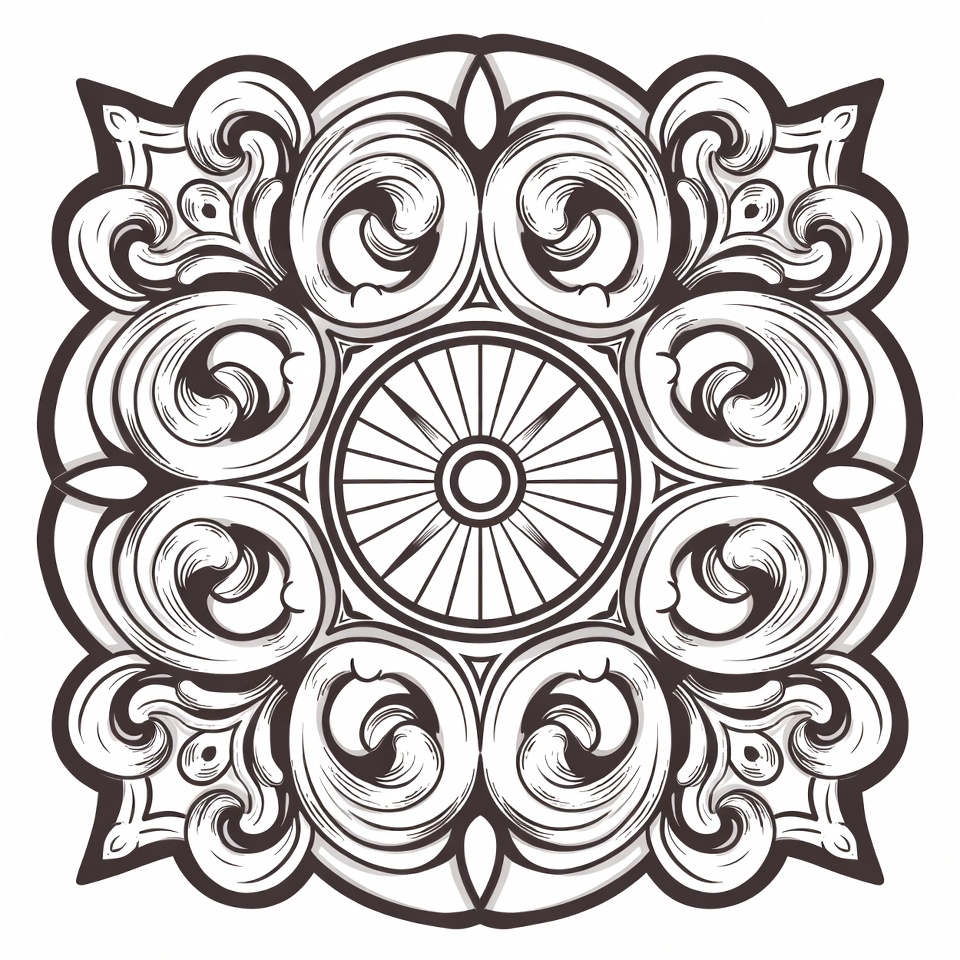 black mandala, circular mandala, clipart, decorative motif, doodle pattern, engraving art, floral curls, floral pattern, graphic element, illustration, intricate design, isolated background, line art, ornate mandala, scrollwork, square frame, swirl pattern, symmetrical design, tattoo design, vector illustration, vintage style, mandala