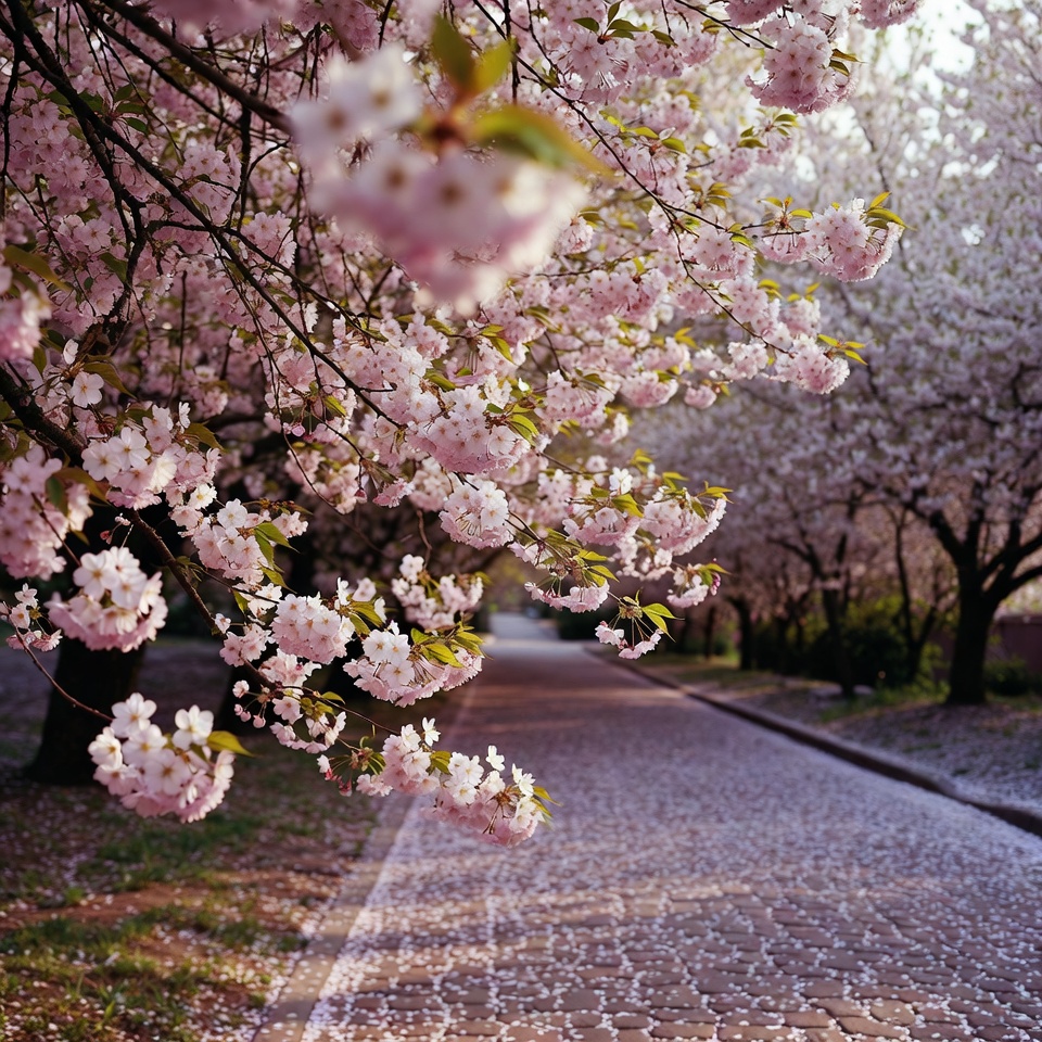 A tree branch with pink cherry blossoms hangs over a cobblestone pathway lined with blooming sakura trees. Sunlight filters through the delicate flowers and green leaves. The path stretches into the distance with scattered petals on the ground.