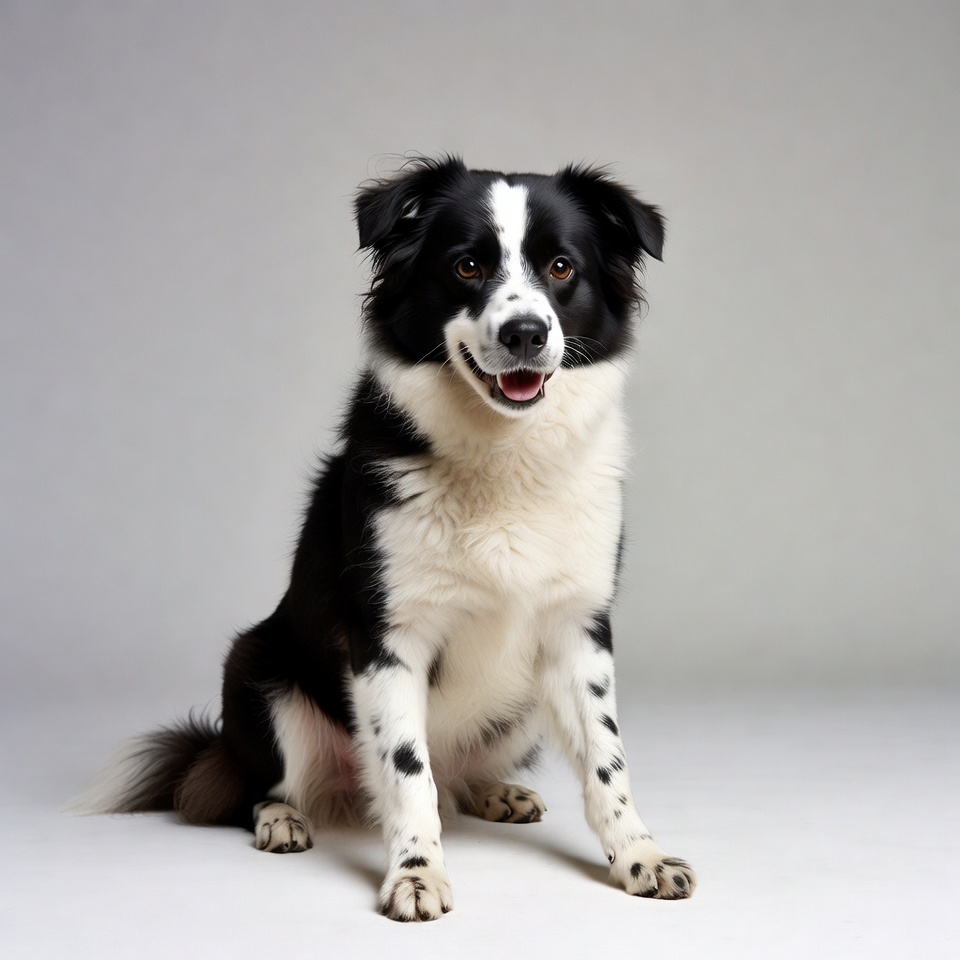 A black and white Border Collie dog sits on a plain gray background. The dog has a fluffy coat with distinctive white markings on its face, chest, paws, and tail tip. It looks directly at the camera with a happy expression, tongue slightly out.