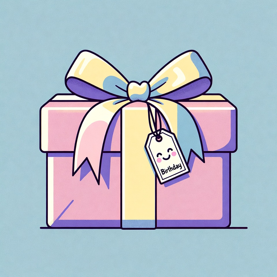 A cute pink gift box with a large yellow bow sits on a blue background. A smiling birthday tag hangs from the blue ribbon on the box. The illustration features clean lines and pastel colors.