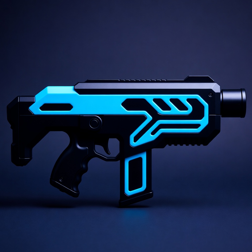 assault rifle, black gun, blaster, blue accents, cyberpunk gun, dark background, gaming weapon, glowing blue, handgun, isolated background, laser gun, neon gun, sci-fi weapon, toy gun, futuristic gun