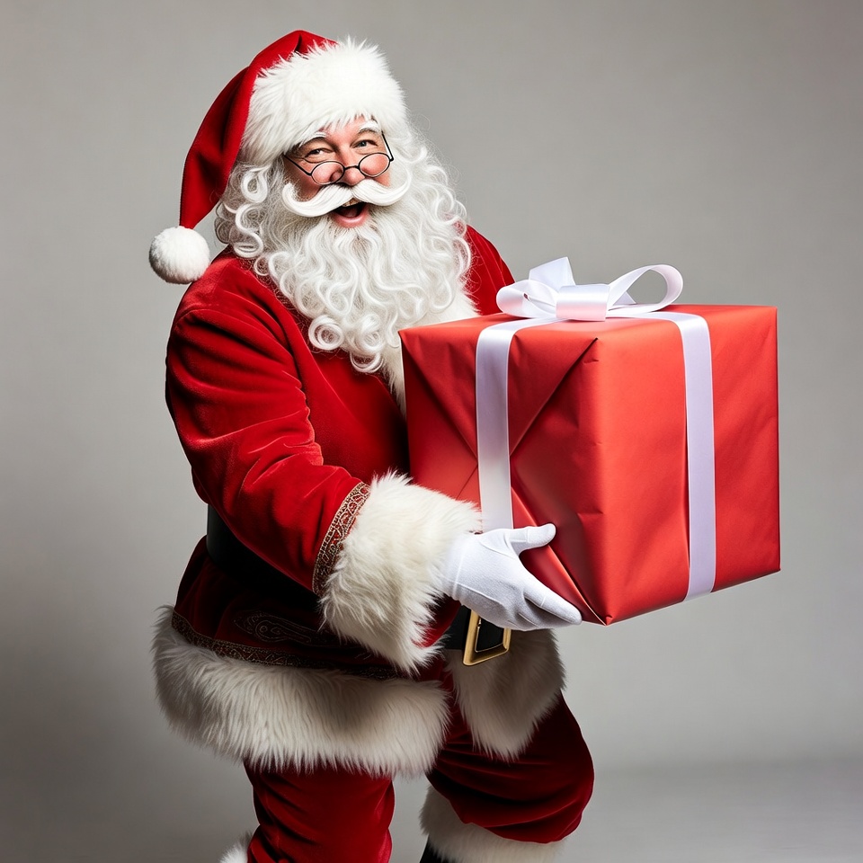 Christmas, Santa, Santa hat, White, black boots, festive, gift box, holiday, isolated background, male, red gift, red suit, smiling, velour suit, white beard, white fur, white gloves, white mustache, white ribbon, Santa Claus