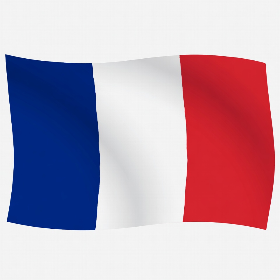 A vibrant French flag waves against a white background. It features vertical stripes of blue on the left, white in the middle, and red on the right. The flag has a dynamic, flowing appearance.