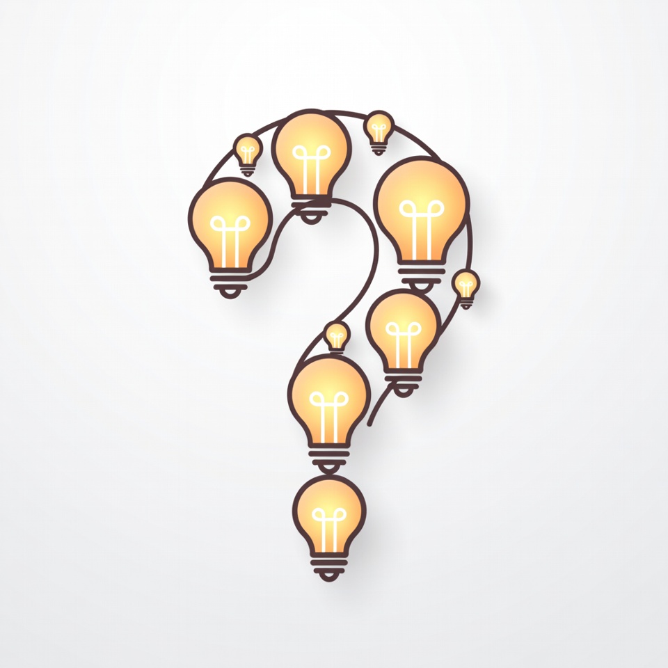 A vector illustration features a large question mark formed by glowing yellow light bulbs connected by curved lines. The design is set against a plain white background with subtle shadows for depth. Multiple incandescent bulbs represent the shape of the punctuation mark.