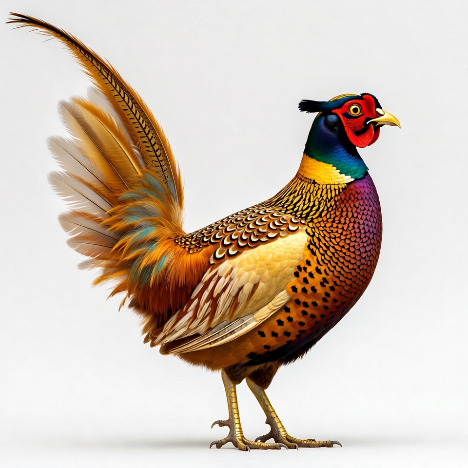 avian, beak, bird, colorful pheasant, crest, feathers, game bird, golden feathers, green neck, isolated, male pheasant, nature, ornate bird, plumage, purple patches, red wattle, standing bird, tail feathers, white background, wildlife, yellow legs, pheasant