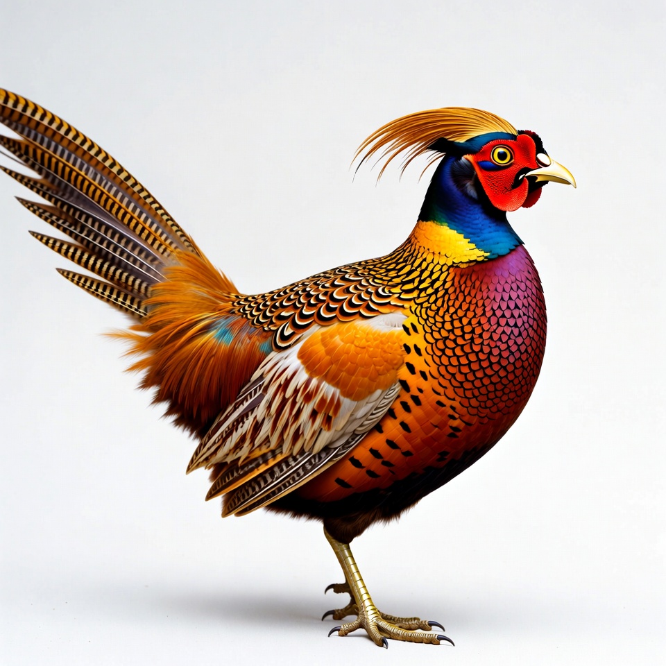 animal, bird, blue neck, colorful feathers, crest, detailed feathers, exotic bird, green accents, isolated background, male peacock, nature, orange plumage, pheasant, red face, standing pose, tail feathers, vibrant colors, white background, wildlife, yellow beak, peacock
