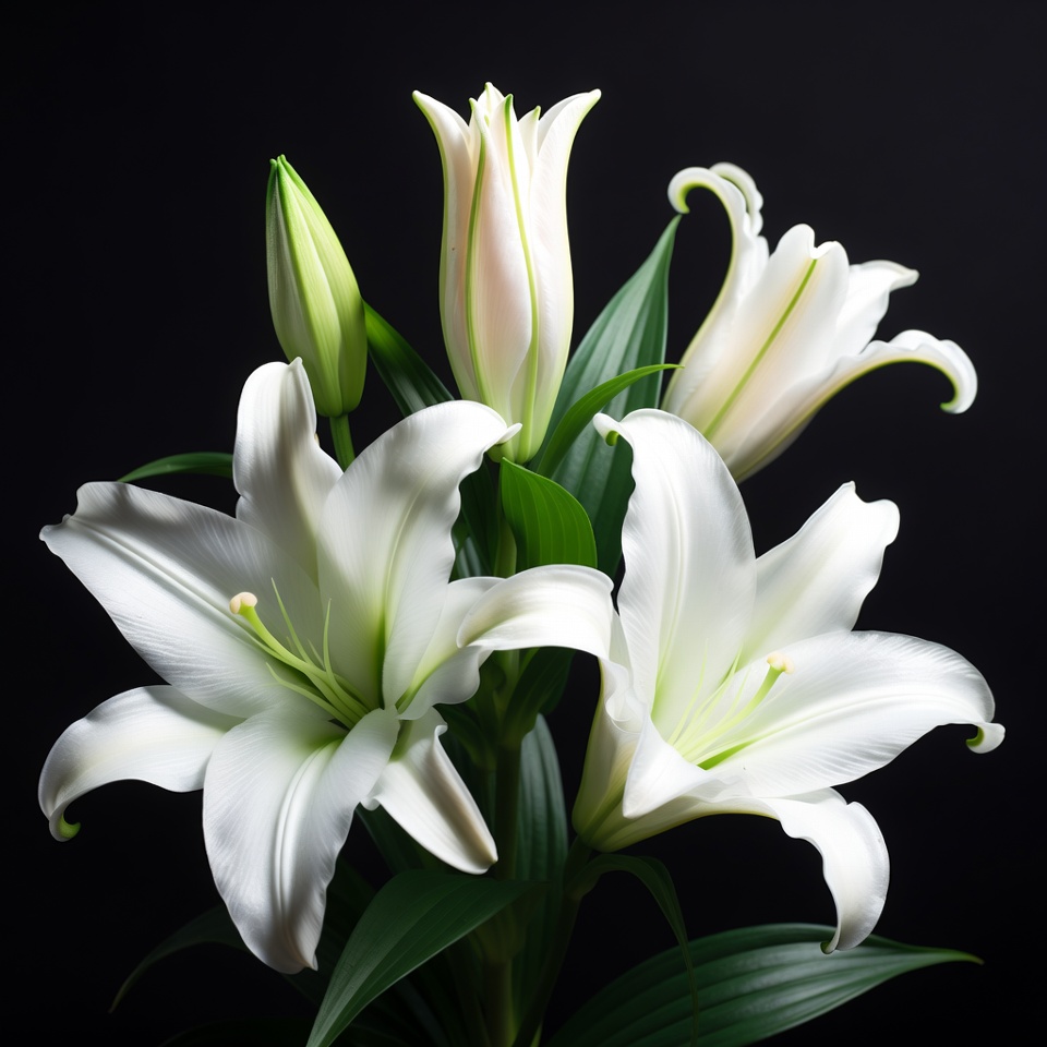 A bouquet of elegant white lilies with green leaves stands against a solid black background. Several fully bloomed flowers feature curved petals and prominent stamens, accompanied by a few buds. The composition highlights the purity and detail of the lilies.