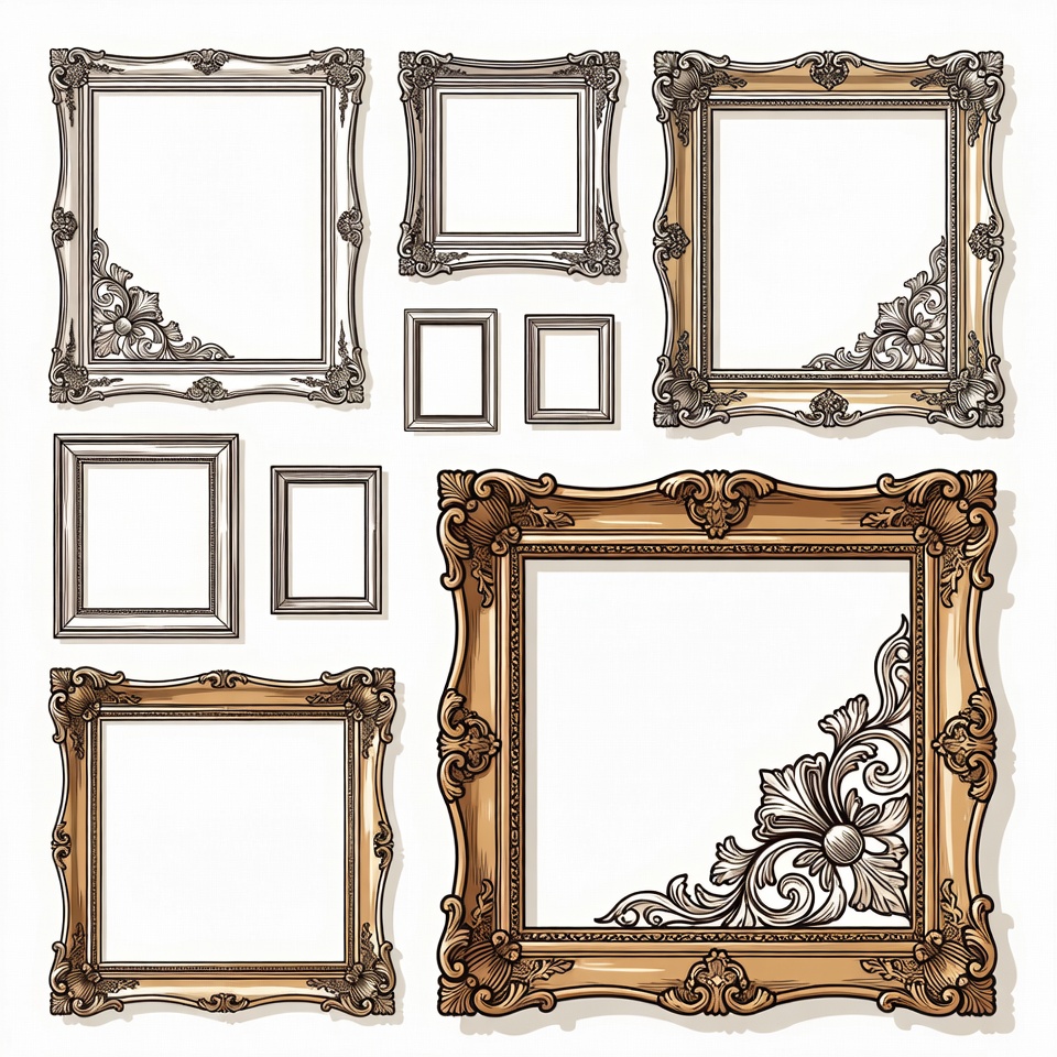 art frames, baroque frames, clipart, decorative frames, empty frames, filigree design, frame collection, gold frames, illustration, isolated background, ornate frames, rococo style, silver frames, vintage frames, picture frames