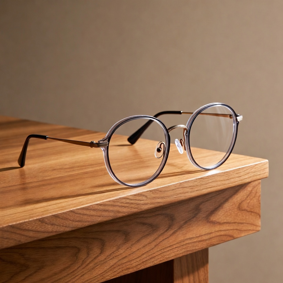 Round clear lens eyeglasses on wooden table