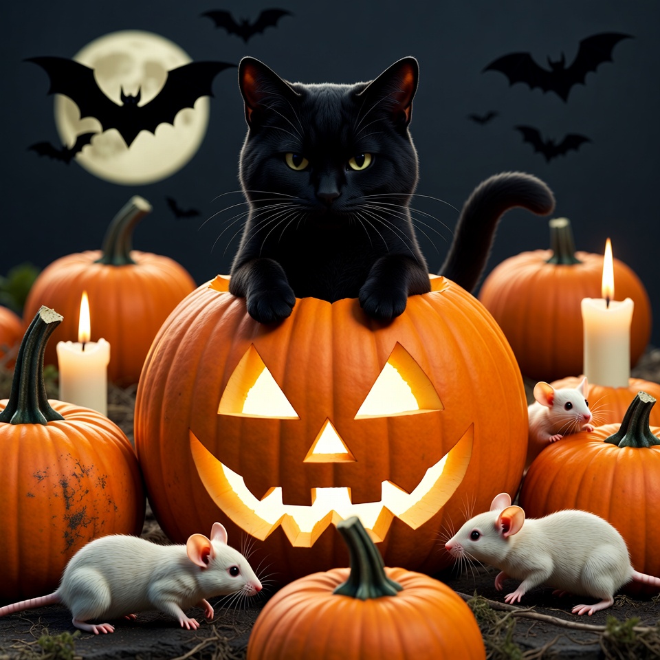 A black cat sits inside a glowing jack-o-lantern pumpkin surrounded by smaller pumpkins and white rats. Bats fly against a dark night sky with a full moon in the background. Candles illuminate the Halloween-themed scene on a textured surface.