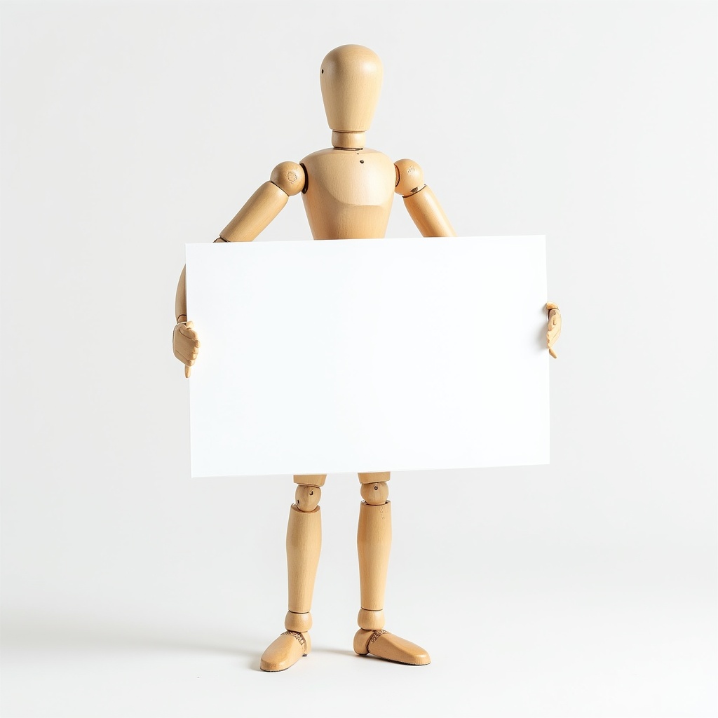 artist's mannequin, blank board, blank sign, figure, holding sign, isolated background, jointed doll, mannequin, pose, puppet, sign holder, standing, toy doll, white background, white sign, wooden mannequin, wooden doll