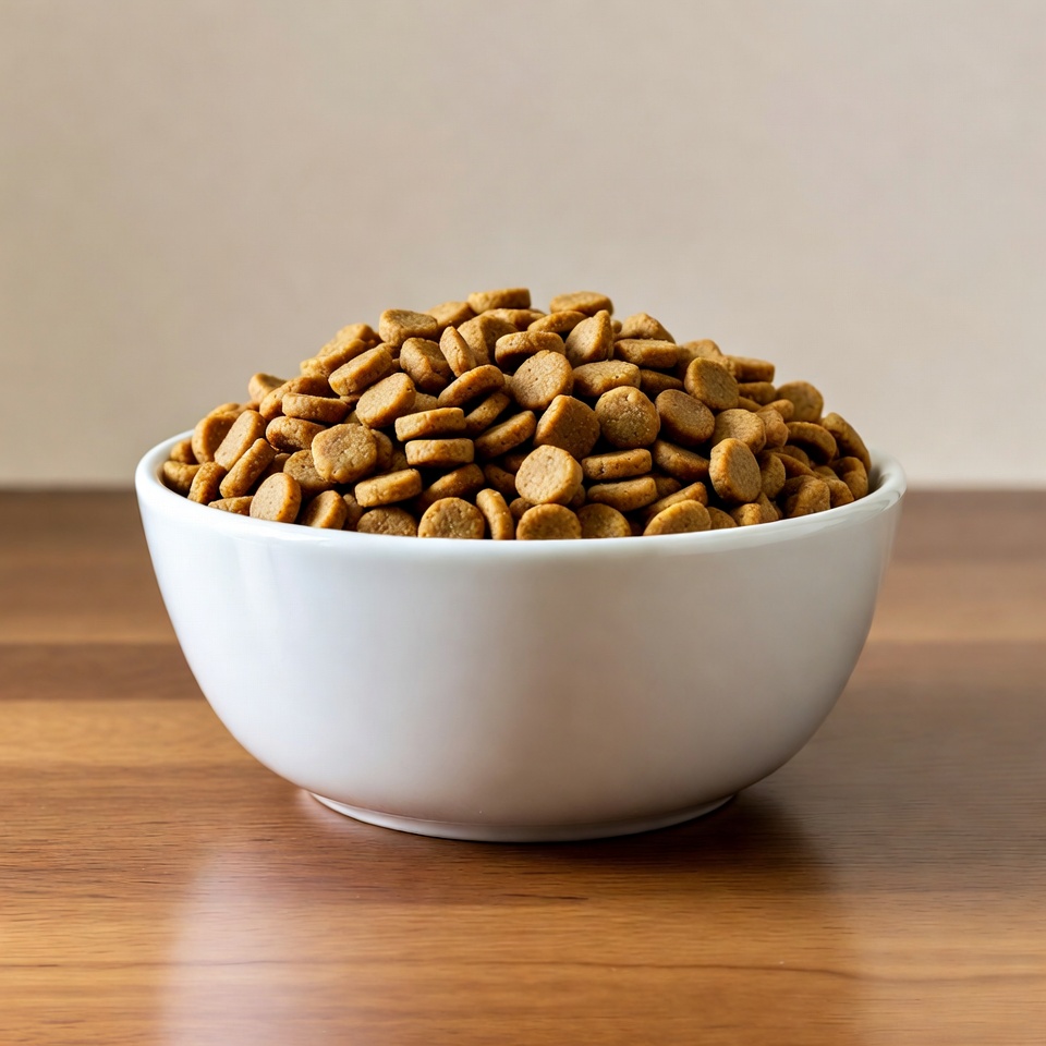 Heap of dry dog kibble in white bowl
