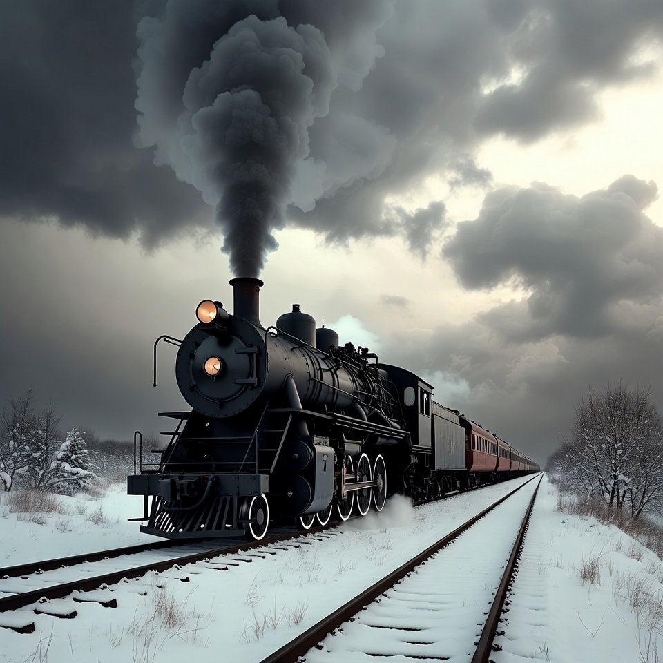 A black steam locomotive train with thick smoke billowing from its stack travels along snowy railroad tracks. The scene features a dramatic stormy sky with dark clouds and a hint of sunlight. Snow-covered trees line the background, and red passenger cars trail behind the engine.