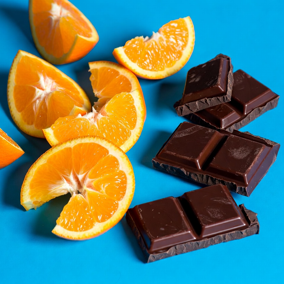 blue background, chocolate, chocolate bars, citrus, cut oranges, dark chocolate, food, fresh fruit, fruit, gourmet, healthy food, isolated, juicy oranges, orange slices, snack, still life, sweet treat, textured chocolate, vibrant colors, oranges