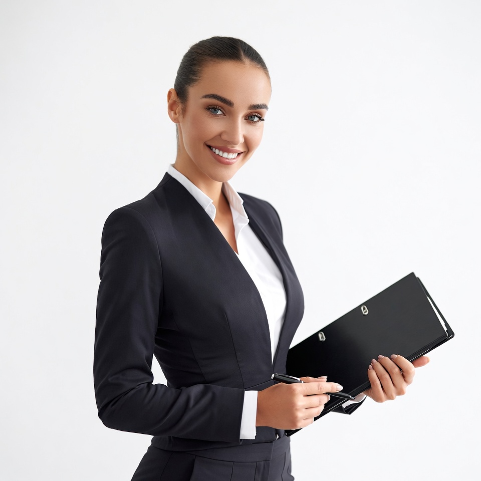 A young woman with dark hair in a bun smiles confidently while holding a black clipboard and pen. She wears a black blazer over a white collared shirt and stands against a plain white background. Her pose is professional with the clipboard positioned at her side.