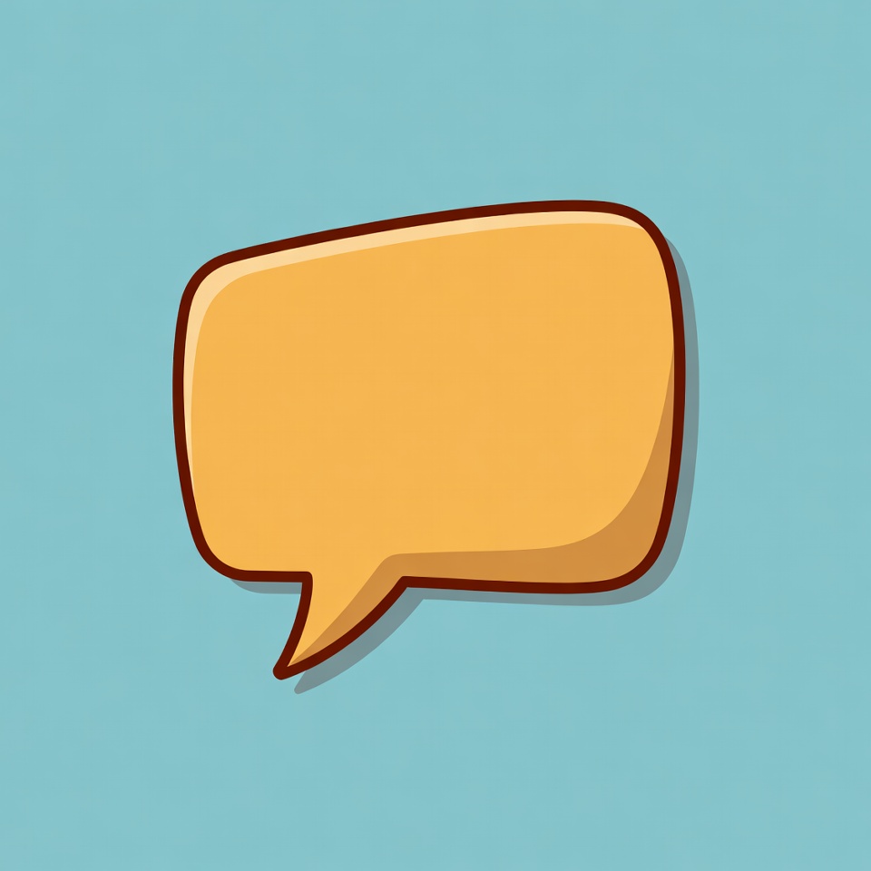 A simple orange speech bubble with a pointed tail floats against a light blue background. The bubble has a rounded rectangular shape with a thick brown outline. It is completely empty inside, ready for text.