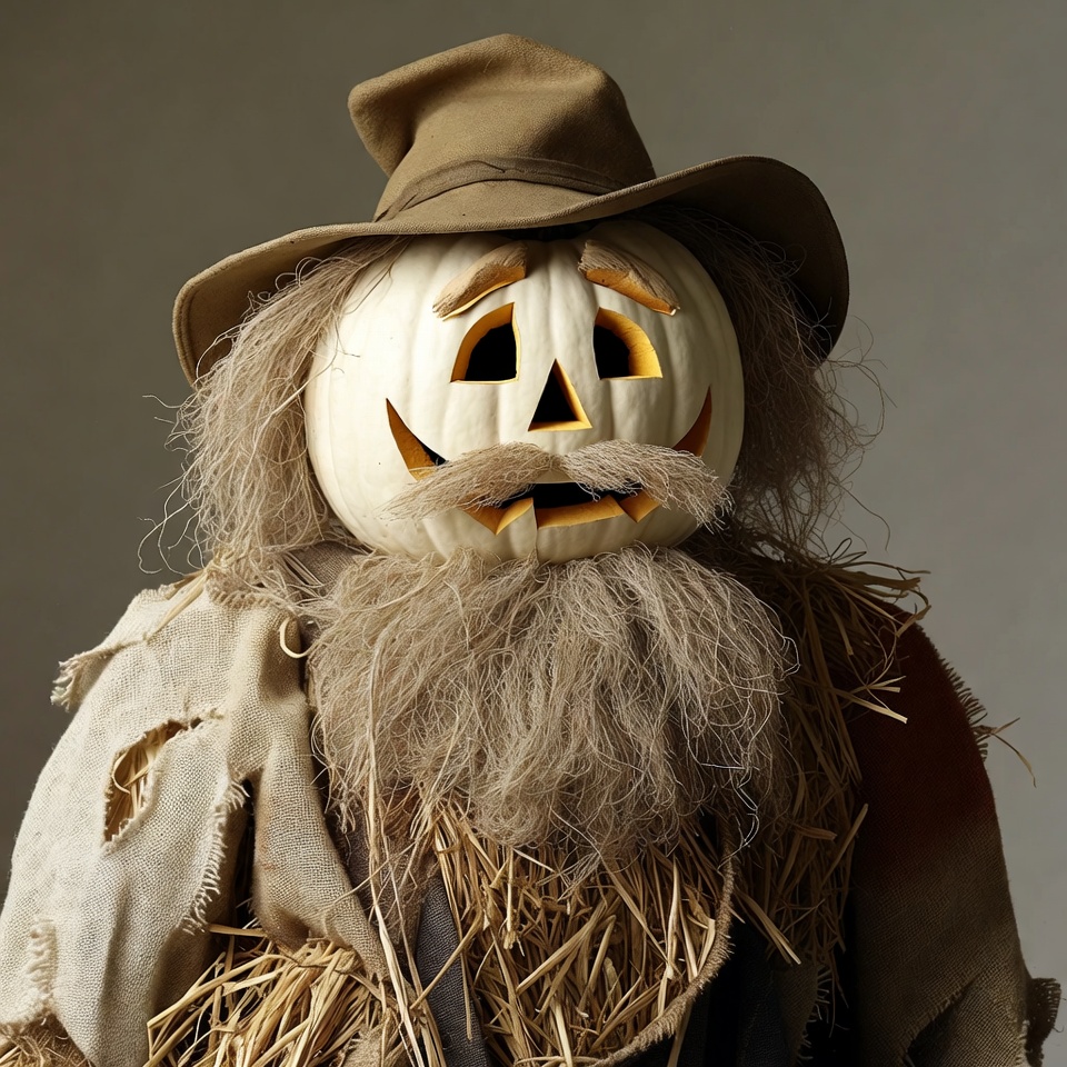 Halloween, Halloween decoration, autumn, brown hat, carved pumpkin, harvest, illustration, isolated background, pumpkin, pumpkin face, pumpkin head, ragged clothes, scarecrow, scarecrow figure, smiling pumpkin, spooky, straw beard, straw body, straw hair, straw hat, jack-o-lantern