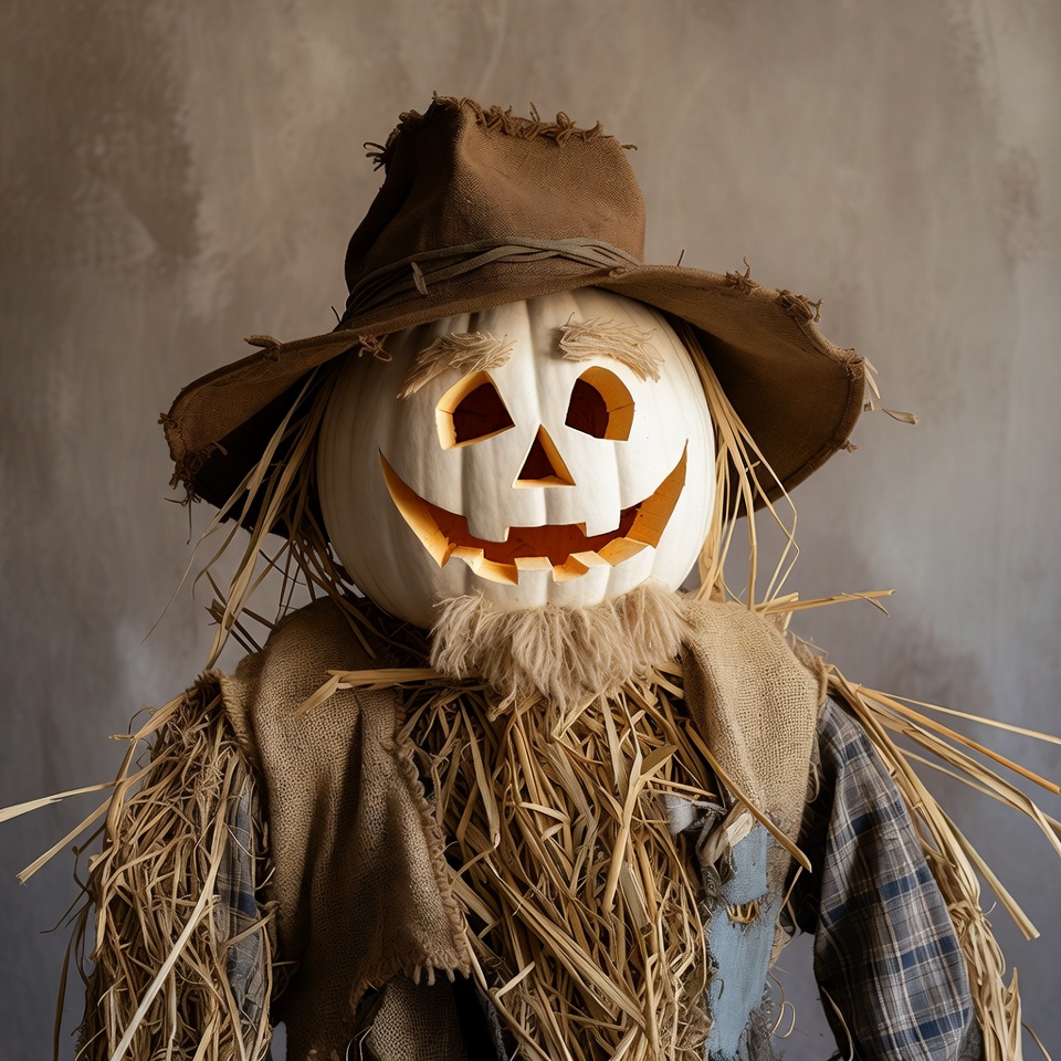 A carved pumpkin scarecrow with a grinning jack-o-lantern face wears a frayed brown hat and ragged plaid shirt. Straw protrudes from its burlap clothing and beard on a neutral background. The pumpkin features glowing triangular eyes and jagged smile.