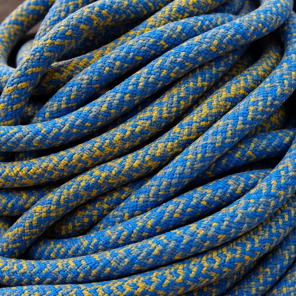 blue rope, braided rope, climbing rope, close-up, coiled rope, fibers, loops, mountaineering, nylon rope, outdoor gear, rock climbing, textured rope, thick rope, yellow rope, rope