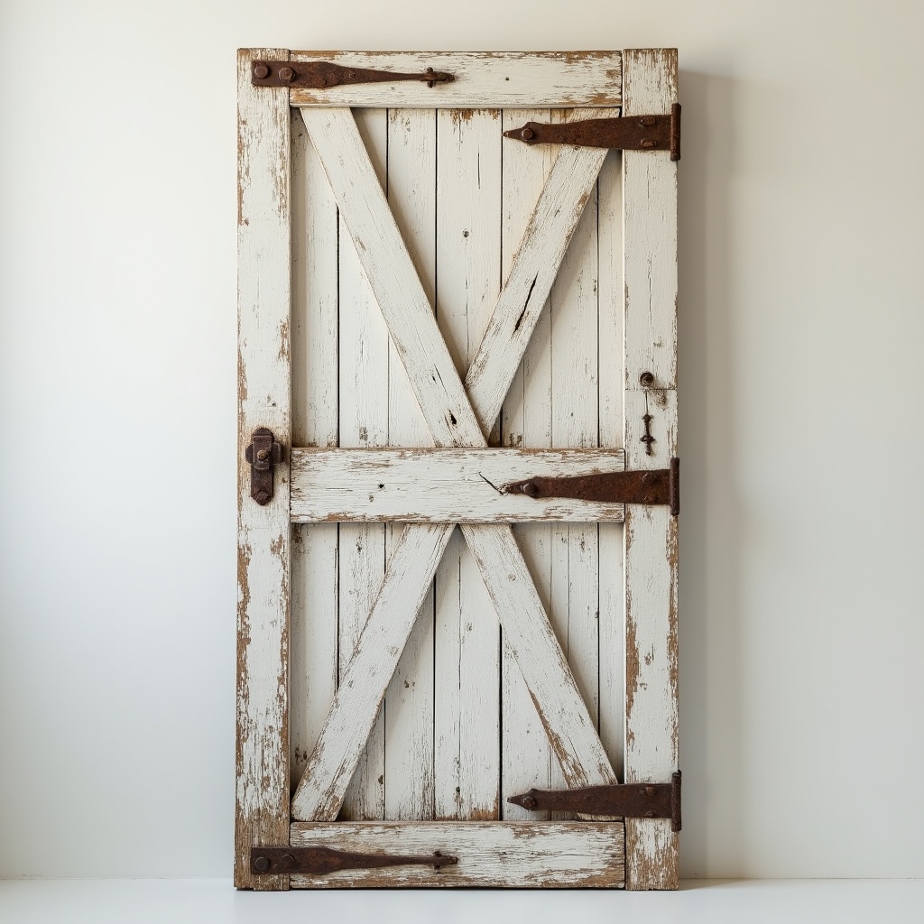 A weathered white wooden barn door stands against a plain background. It features a prominent X-shaped cross brace and rustic iron hinges and latch. The door shows signs of age with chipped paint and distressed wood texture.
