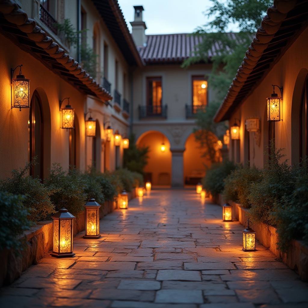 A narrow stone-paved walkway runs through a Spanish-style courtyard at dusk. Lanterns glow warmly along the beige stucco walls and arched doorways. Potted plants and trees frame the serene passage under a twilight sky.