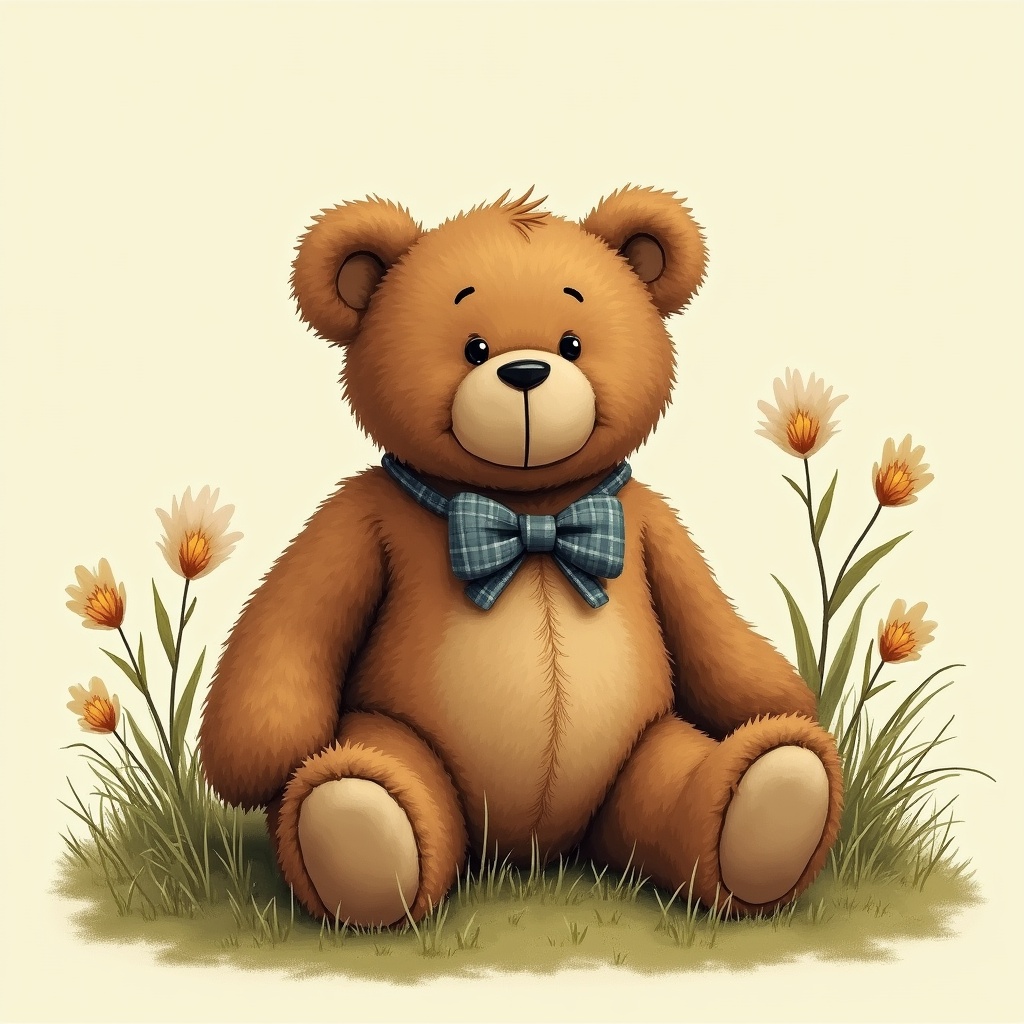 A fluffy brown teddy bear with a plaid blue bowtie sits on green grass surrounded by white daisies. The bear has a cheerful expression with big eyes and a smiling mouth. It is rendered in a cute digital illustration style on an isolated background.