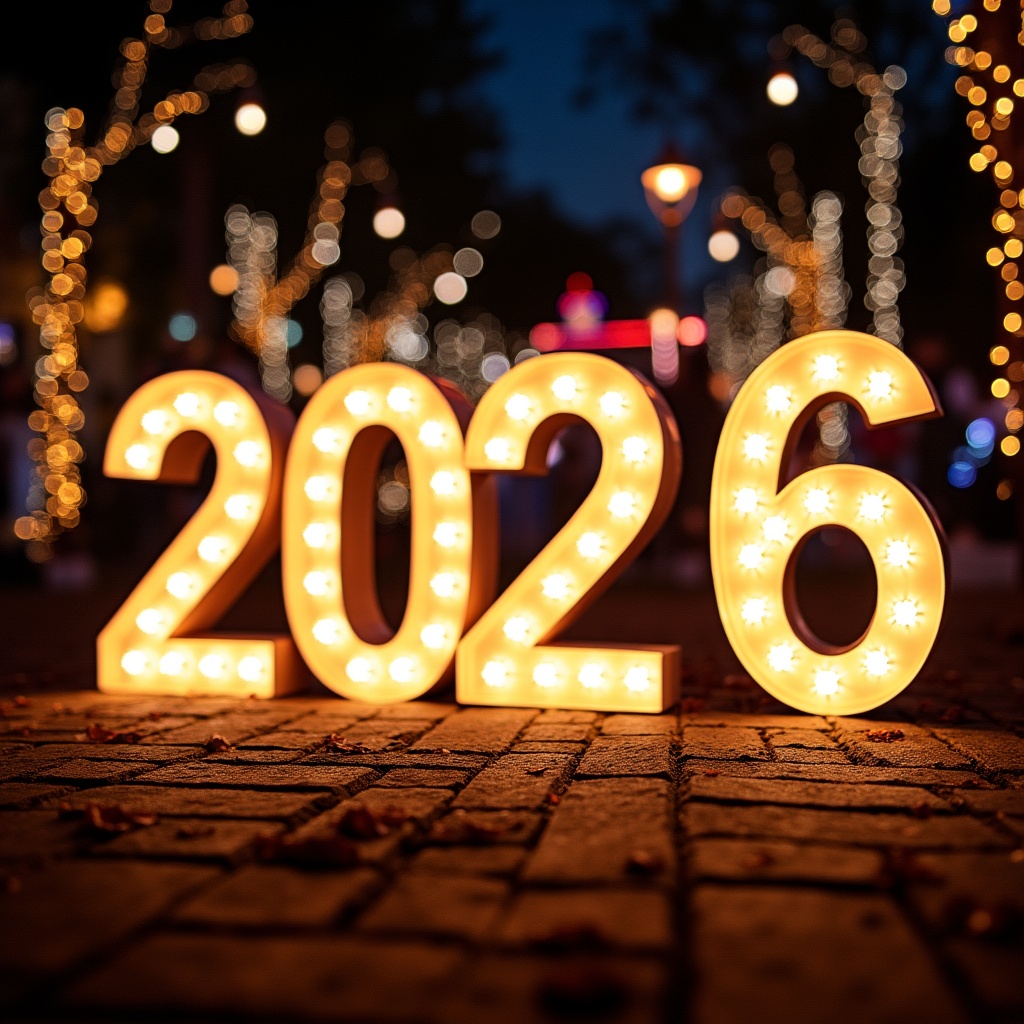 New Year, blur, bokeh, brick pavement, celebration, countdown, dark background, fairy lights, festive, future year, glowing letters, holiday, illuminated sign, night, outdoor, party, street lights, urban street, yellow lights, 2026