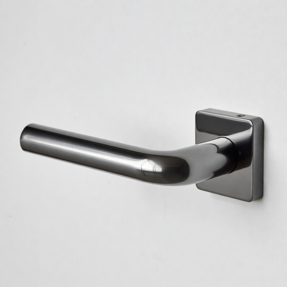 black handle, contemporary design, door hardware, door lever, escutcheon plate, hardware, isolated background, lever handle, matte black, modern handle, white wall, door handle