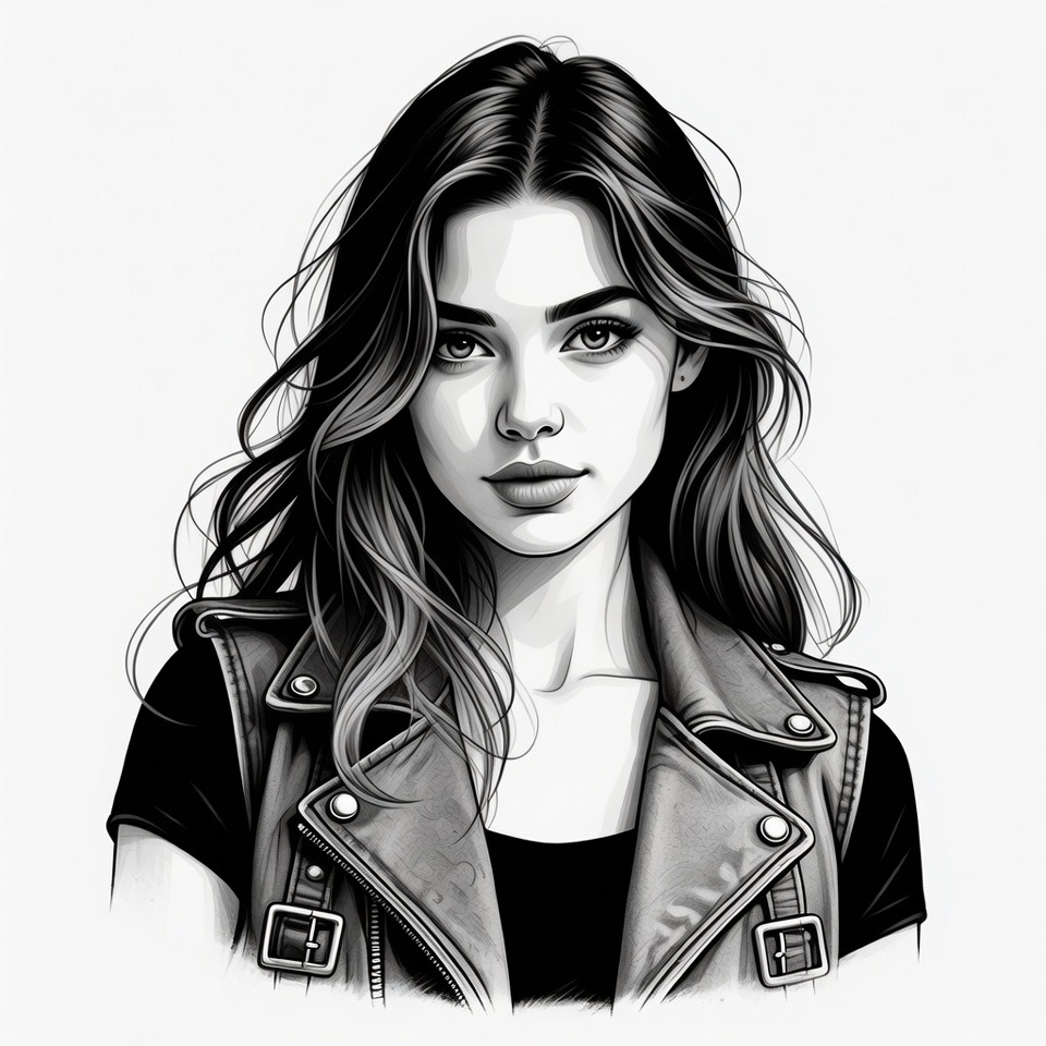 A young woman with long wavy dark hair gazes forward in a detailed black and white illustration. She wears a black leather jacket with silver zippers over a black top. Her face features striking eyes, full lips, and soft facial contours on an isolated white background.