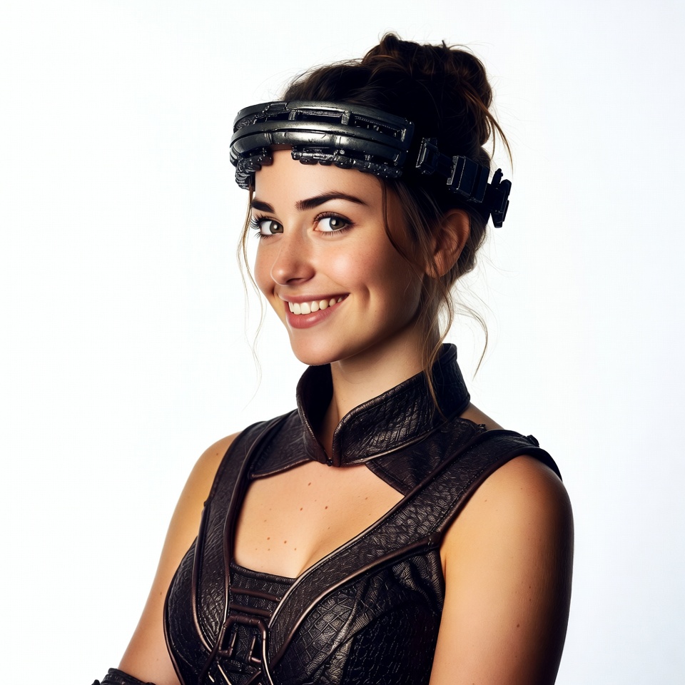 Neuralink, White, arm guards, black clothing, brain implant, brown hair, bun hairstyle, female, futuristic, green eyes, headband, high collar, leather outfit, neurotech, sci-fi, smiling woman, technology, white background, young woman, woman