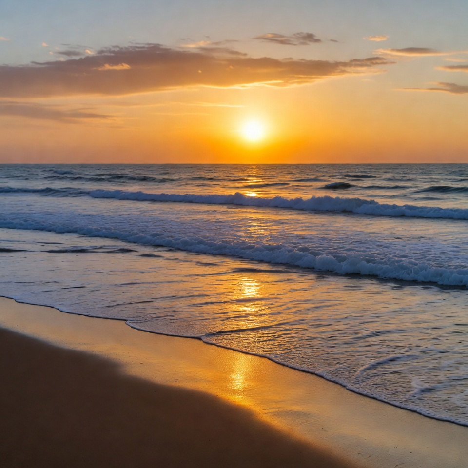 A vibrant sunset illuminates the sky with orange, pink, and purple hues over a calm ocean. Gentle waves crash on the sandy beach, reflecting the golden sunlight. The sun hovers low on the horizon, casting a warm glow across the water.