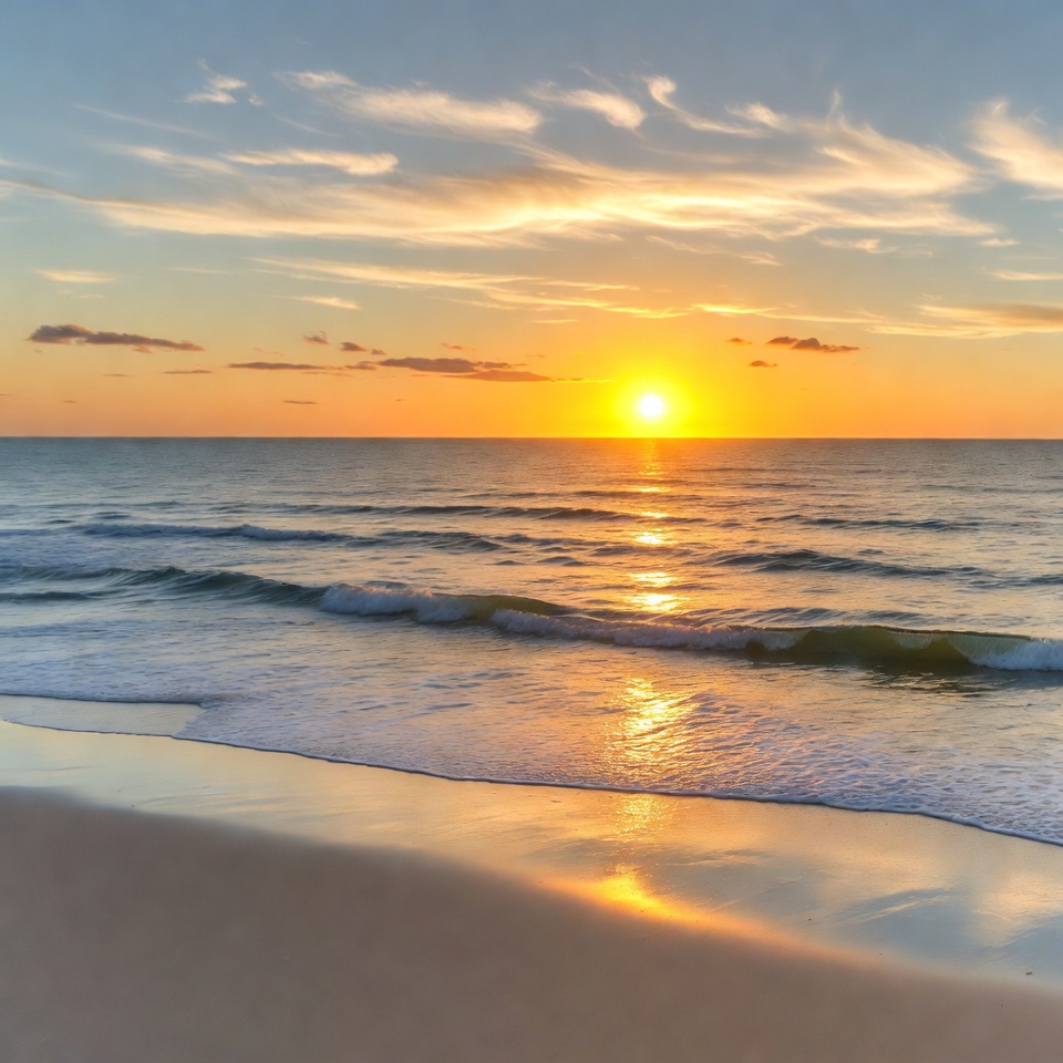 A vibrant sunset illuminates the sky with orange, pink, and blue hues over a calm ocean. Gentle waves crash onto a sandy beach in the foreground, reflecting the golden sunlight. Wispy clouds streak across the horizon.