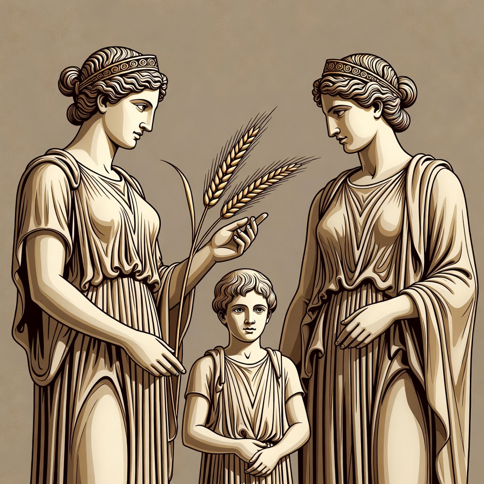An illustration depicts two ancient Greek-style women in flowing draped gowns standing on either side of a young boy. The women hold stalks of wheat in their hands, with one gesturing toward the grain. All three figures have classical features and are rendered in a detailed line art style on a beige background.