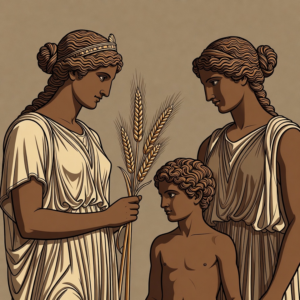 An illustration depicts three ancient Greek-style figures in terracotta tones on a beige background. Two women in flowing white draped garments stand attentively, one holding a sheaf of wheat. A young nude boy stands between them, looking up at the wheat.