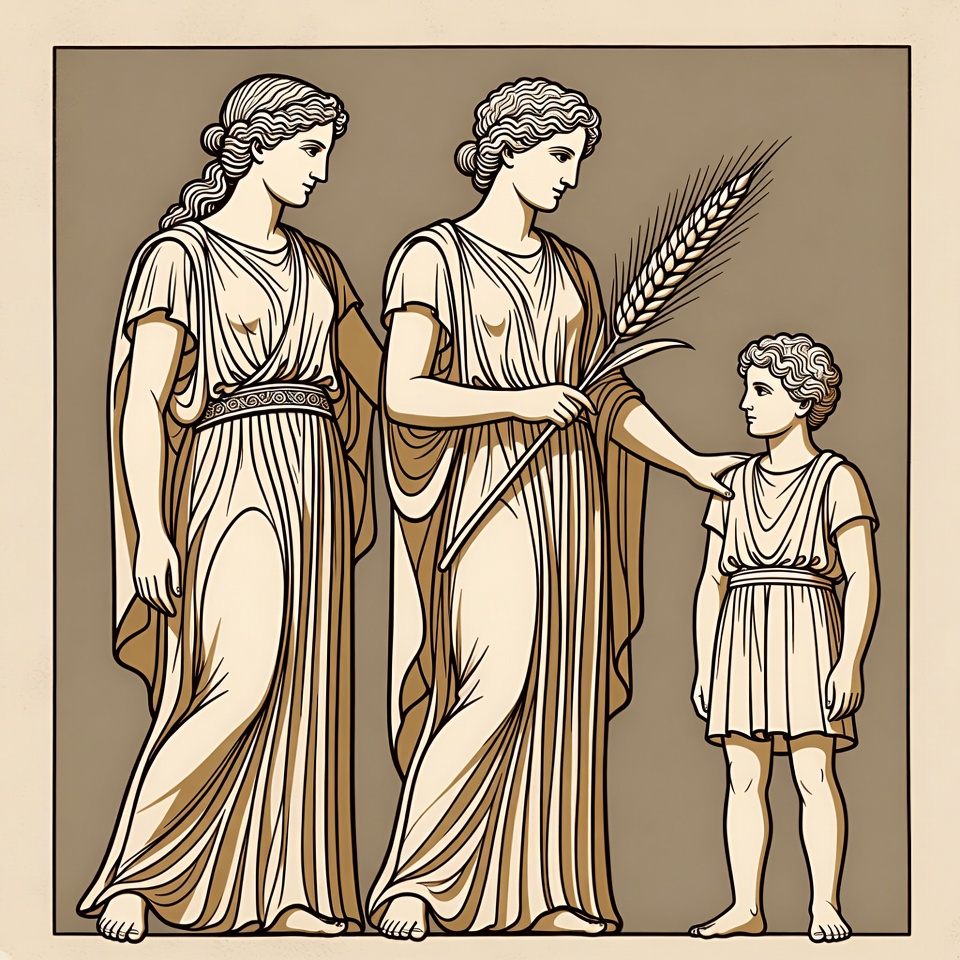 An illustration depicts three women in flowing ancient Greek chitons standing together on a beige background. The central woman holds a sheaf of wheat, while a young boy in a short tunic stands beside her, reaching out. All figures are rendered in a classical line art style with detailed drapery and serene expressions.