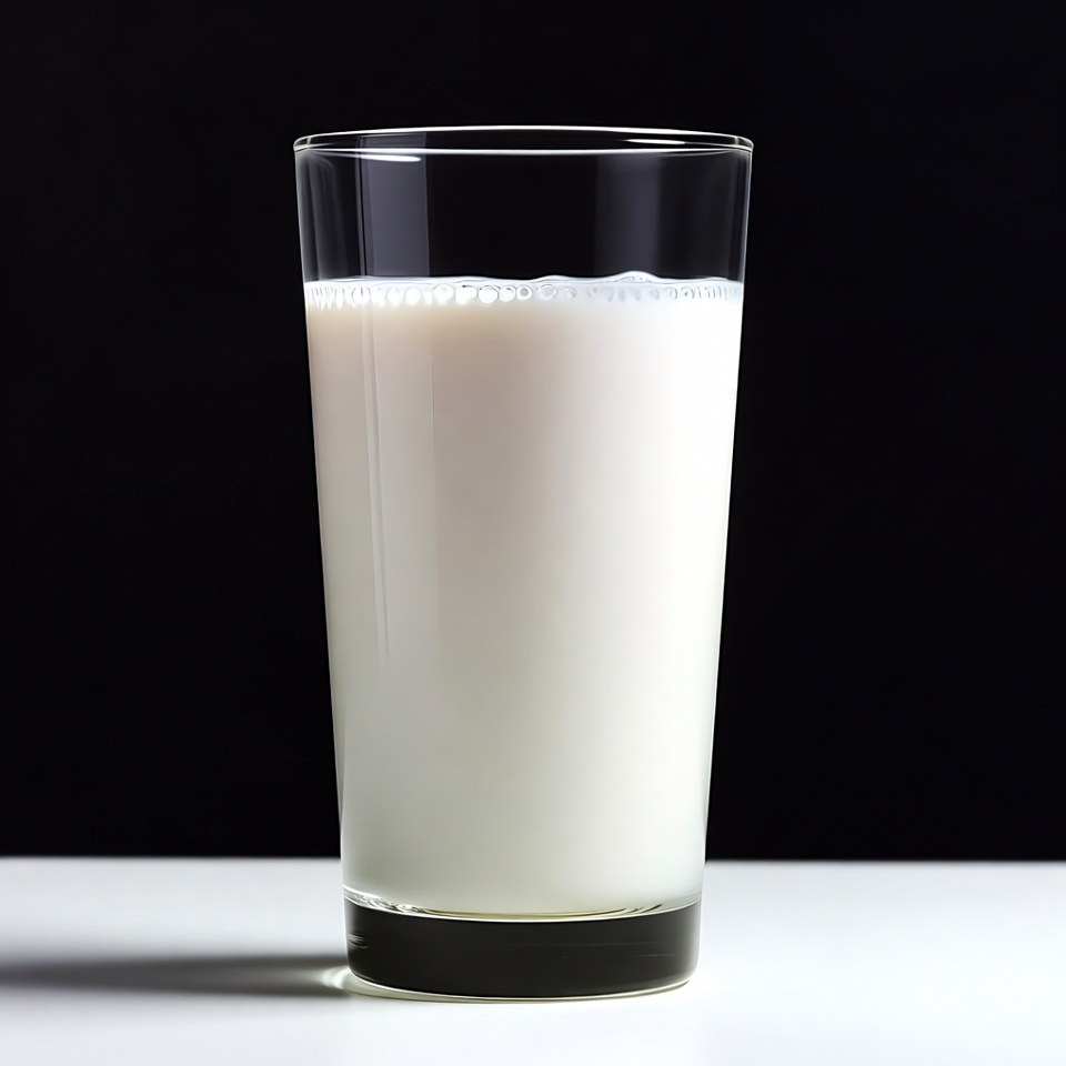 A clear glass tumbler filled with white milk stands on a white surface. The glass has a black background, highlighting the milk's creamy texture and slight foam on top. The image is a close-up product shot with sharp focus on the glass.