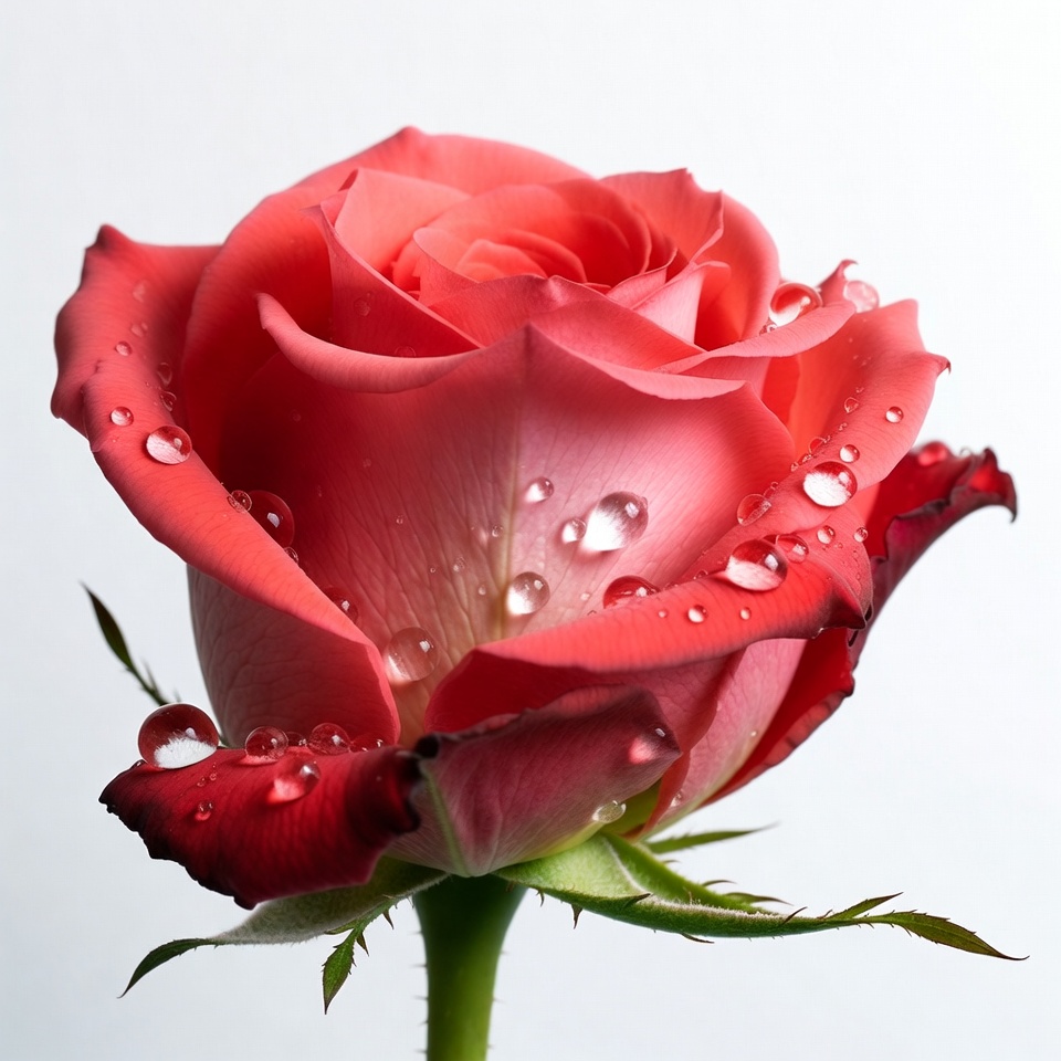 beauty, closeup flower, dew drops, dewy rose, floral, flower, fresh flower, garden flower, green stem, isolated background, macro flower, nature, petals, red rose, romantic flower, rose bloom, rose flower, water droplets, white background, pink rose